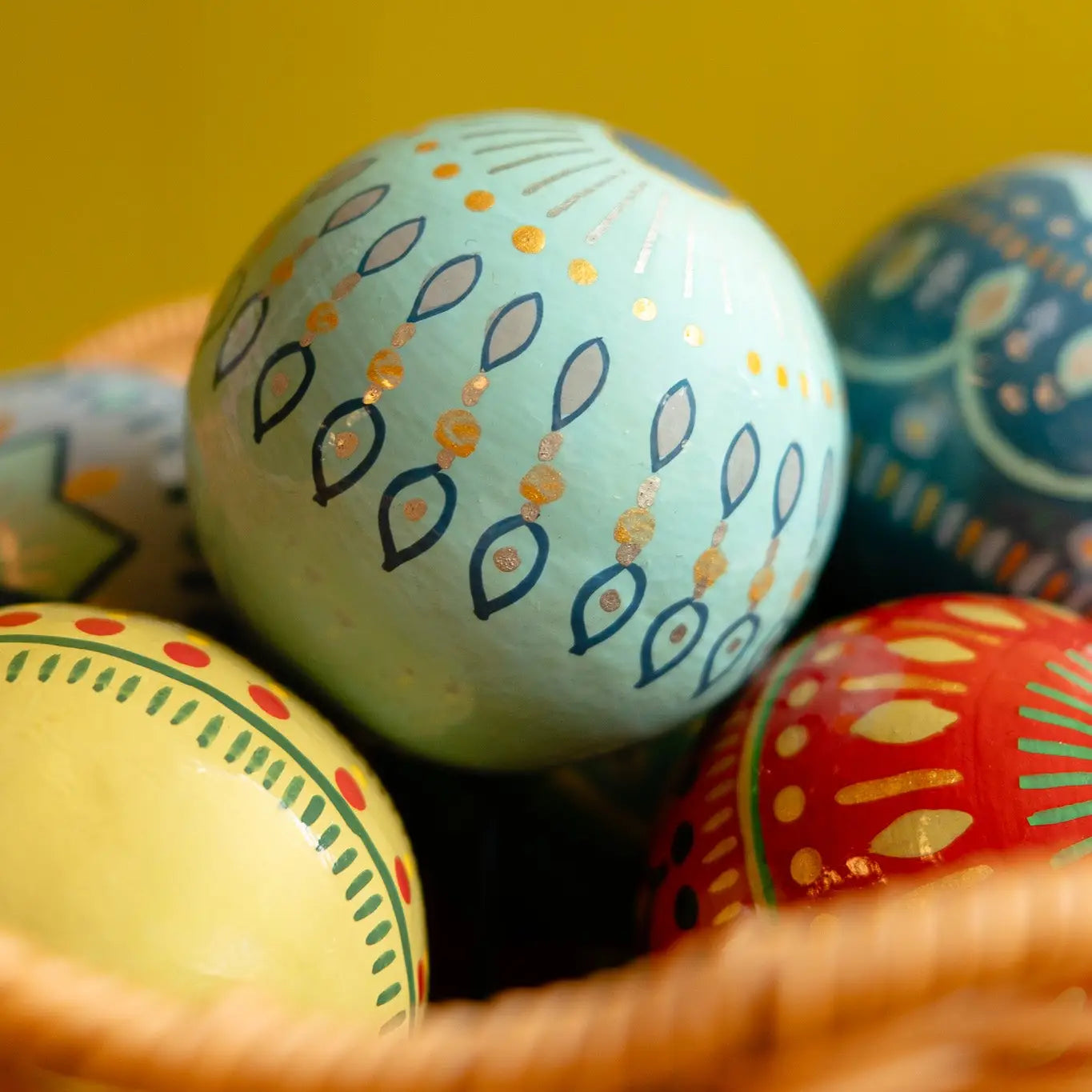 These beautiful baubles are all made from papier mâché recycled paper, hand-painted with intricate, colourful illustrations, and have a soft velvet hanging loop.