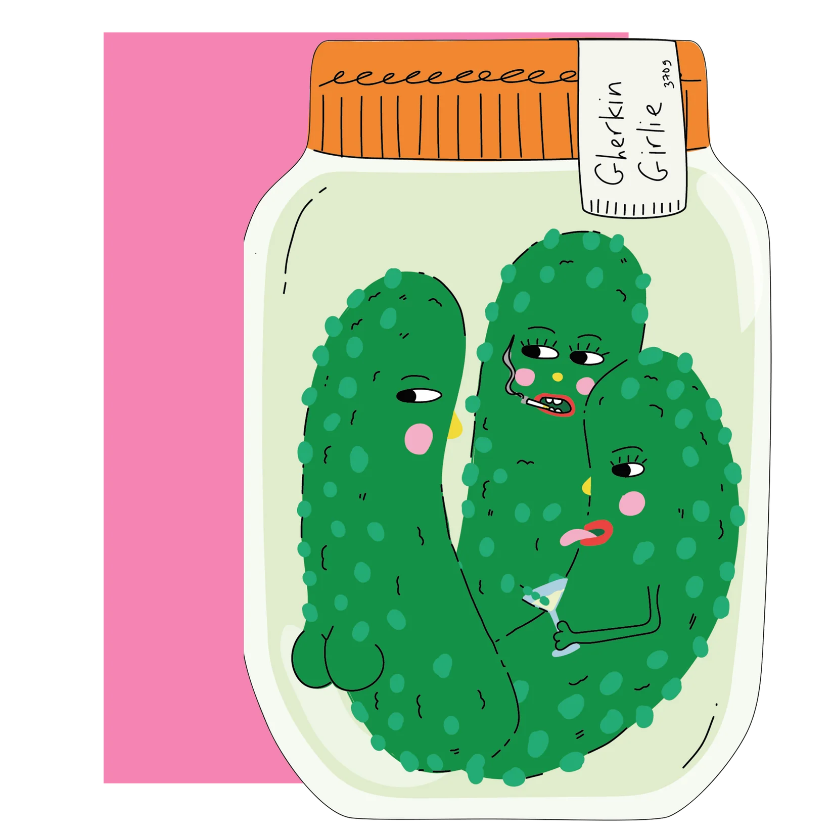 Gherkin Girlie greeting card is part of Eat The Moon's new 'foodie collection' a wildly expressive range of die-cut cards starring fruits, veggies, and pantry faves with bold personalities. These cheeky snack core characters are