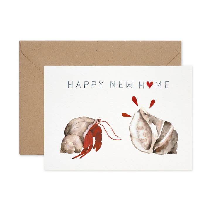Illustrated new home greeting card featuring hermit crab shell design and hand lettering which reads: "Happy New Home".